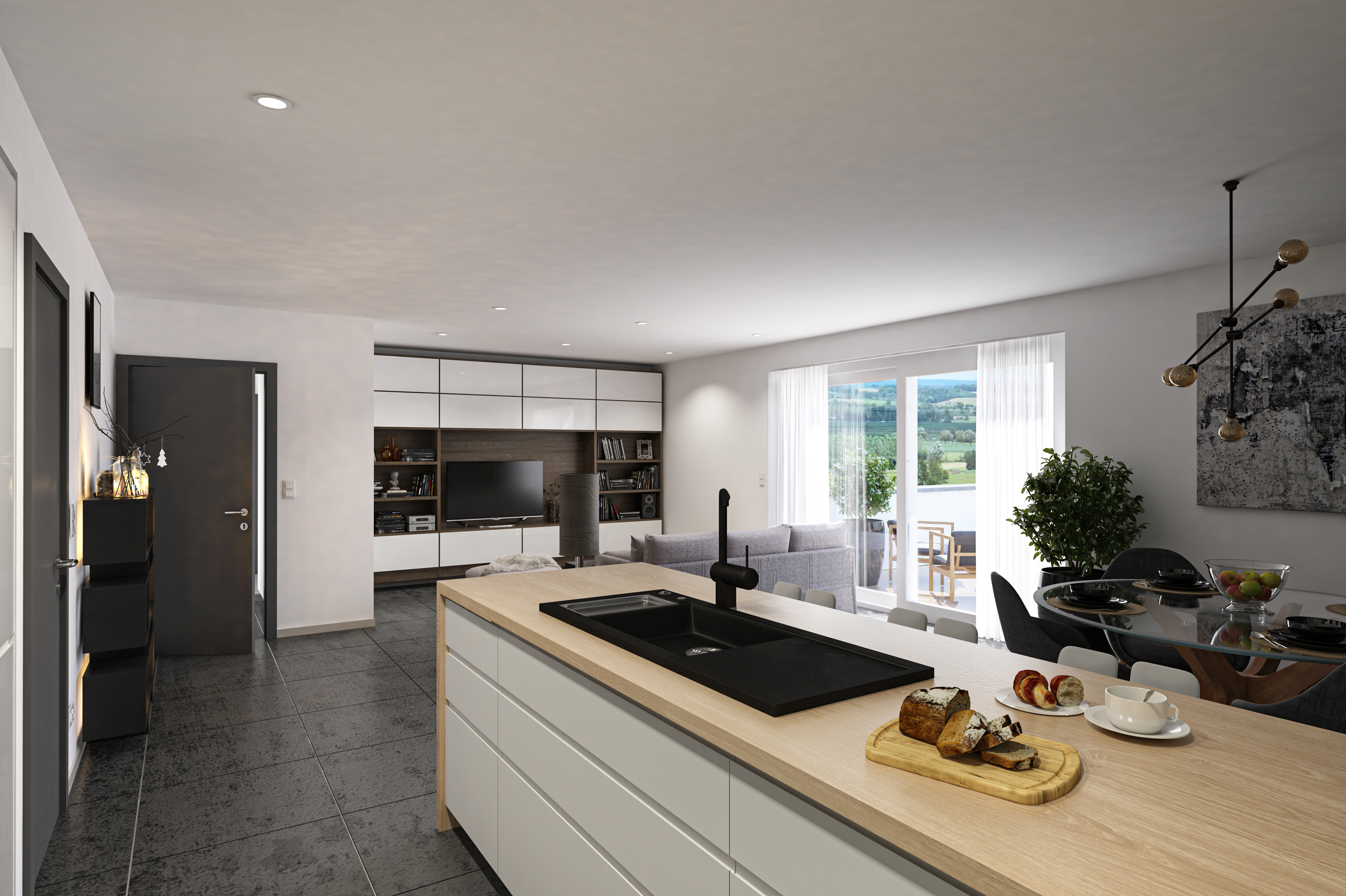 L'appartement se compose d'un hall d'entrée avec WC séparé, un grand séjour avec cuisine ouverte, 2 chambres, une salle de douche et une buanderie.