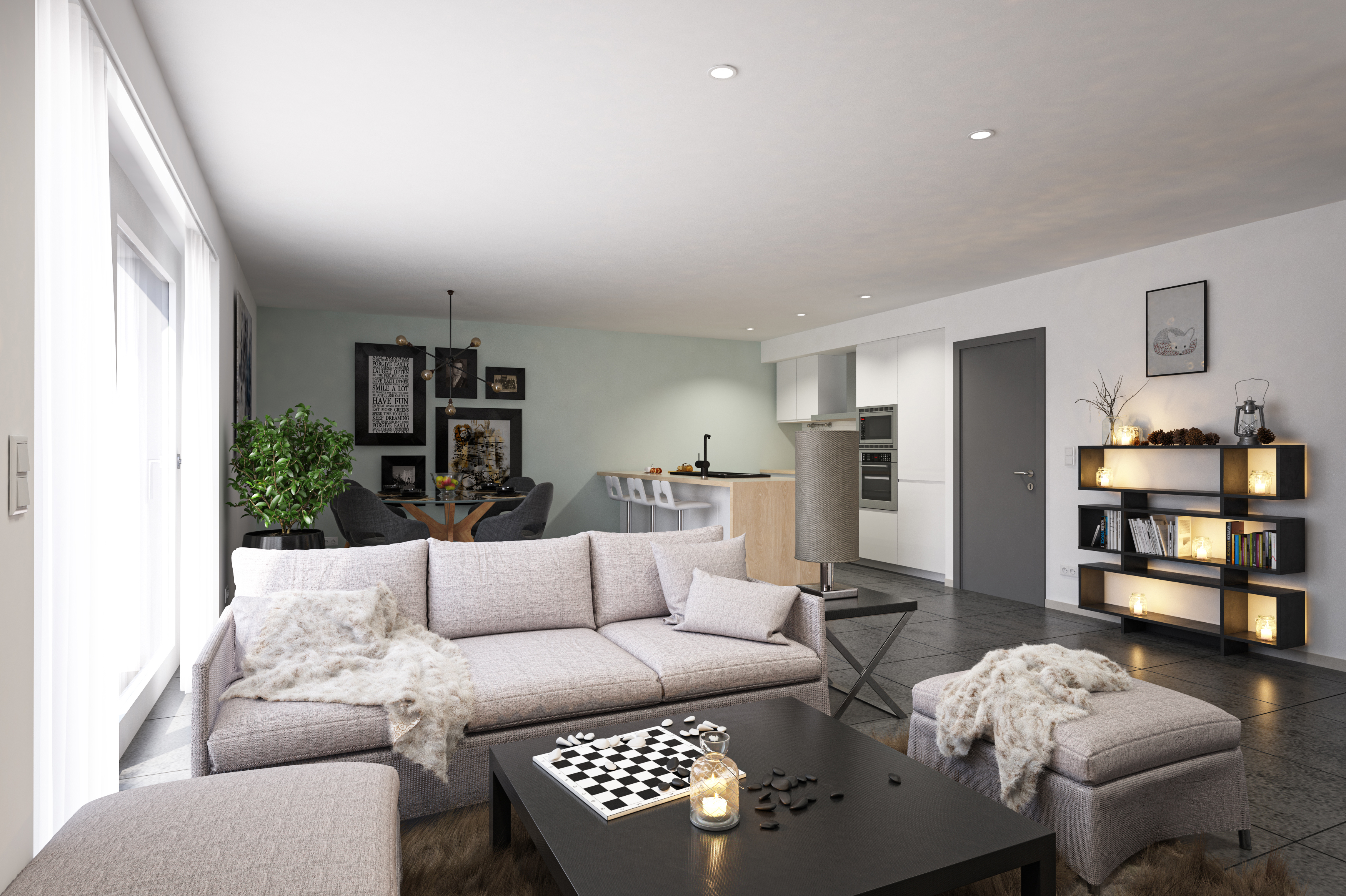 L'appartement se compose d'un hall d'entrée avec WC séparé, un grand séjour avec cuisine ouverte, 2 chambres, une salle de douche et une buanderie.