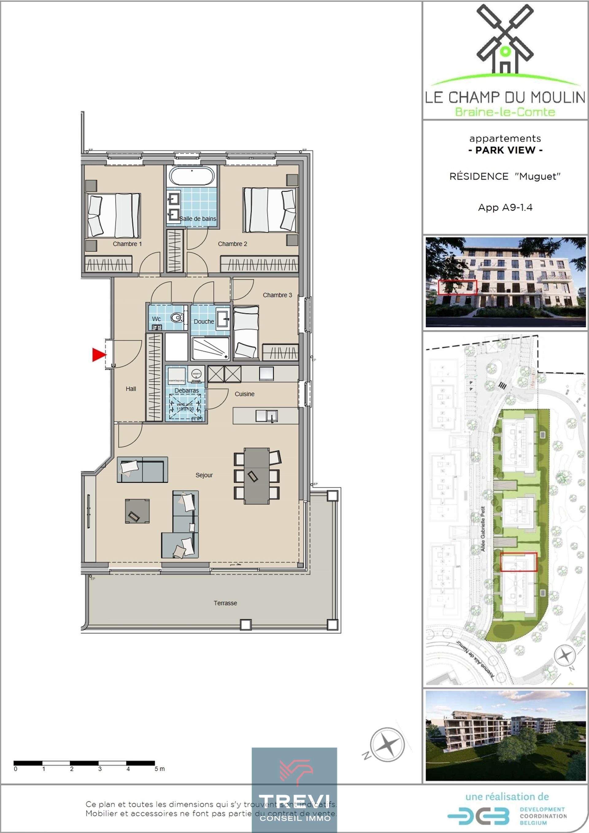 EXCLUSIF !!!! Découvrez EN AVANT PREMIERE la nouvelle Résidence "MUGUET" disponible à la vente depuis ce 15/08/2025 !! Soyez les premiers à réserver l'appartement de vos rêves dans le magnifique quartier "Le Champ du Moulin". La nouvelle résidence Muguet propose 18 appartements de grande qualité avec de belles terrasses face au grand parc paysagé dont ce magnifique appartement d'angle face au parc de 117 m² proposant 3 belles chambres et une belle terrasse d'angle de 20 m². Il se compose d'un hall d'entrée avec vestiaire vers le splendide séjour d'angle très lumineux et sa porte coulissante vers la belle terrasse d'angle. Jolie cuisine ouverte avec îlot et buanderie attenante. Hall de nuit vers les 3 belles chambres. La chambre principale dispose de sa salle de bain privative. 2 autres belles chambres, une toilette séparée et une salle de douche complètent ce bel appartement et sa vue imprenable sur le parc. Ce joli quartier vous ravira par sa verdure et ses facilités avec notamment la présence d'un supermarché dans le complexe et sa situation exclusive dans un cadre de quiétude et de verdure à seulement quelques minutes de la gare et du centre-ville. Performance énergétique A+. Pompe à chaleur. Faites le choix des finitions et jouissez d'un appartement basse énergie dans un environnement d'exception ! Pour plus d'infos et/ou une visite de l'appartement témoin, contactez-nous au 02 355 50 55.