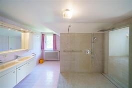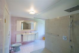 Salle de douches : Douche italienne, double évier, meuble de rangement et bidet